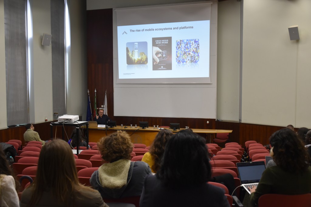 Na conferência “Journalism amid the Age of Platformization”, Oscar Westlund abordou a forma como a ascensão das plataformas digitais está a transformar profundamente o jornalismo, alterando os seus modelos de receita, as práticas de produção e a relação com o público. O investigador também destacou que a transição para os ecossistemas móveis, motivada pela tentativa de alcançar audiências mais jovens, trouxe novos desafios para os meios de comunicação, como o longo processo de desenvolvimento e aprovação de aplicações para dispositivos móveis. Este cenário impulsionou o fenómeno da “platformization”, caracterizado pela penetração das plataformas digitais em diversas esferas – económicas, governamentais e infraestruturais – que passaram a influenciar diretamente as operações da indústria dos media.