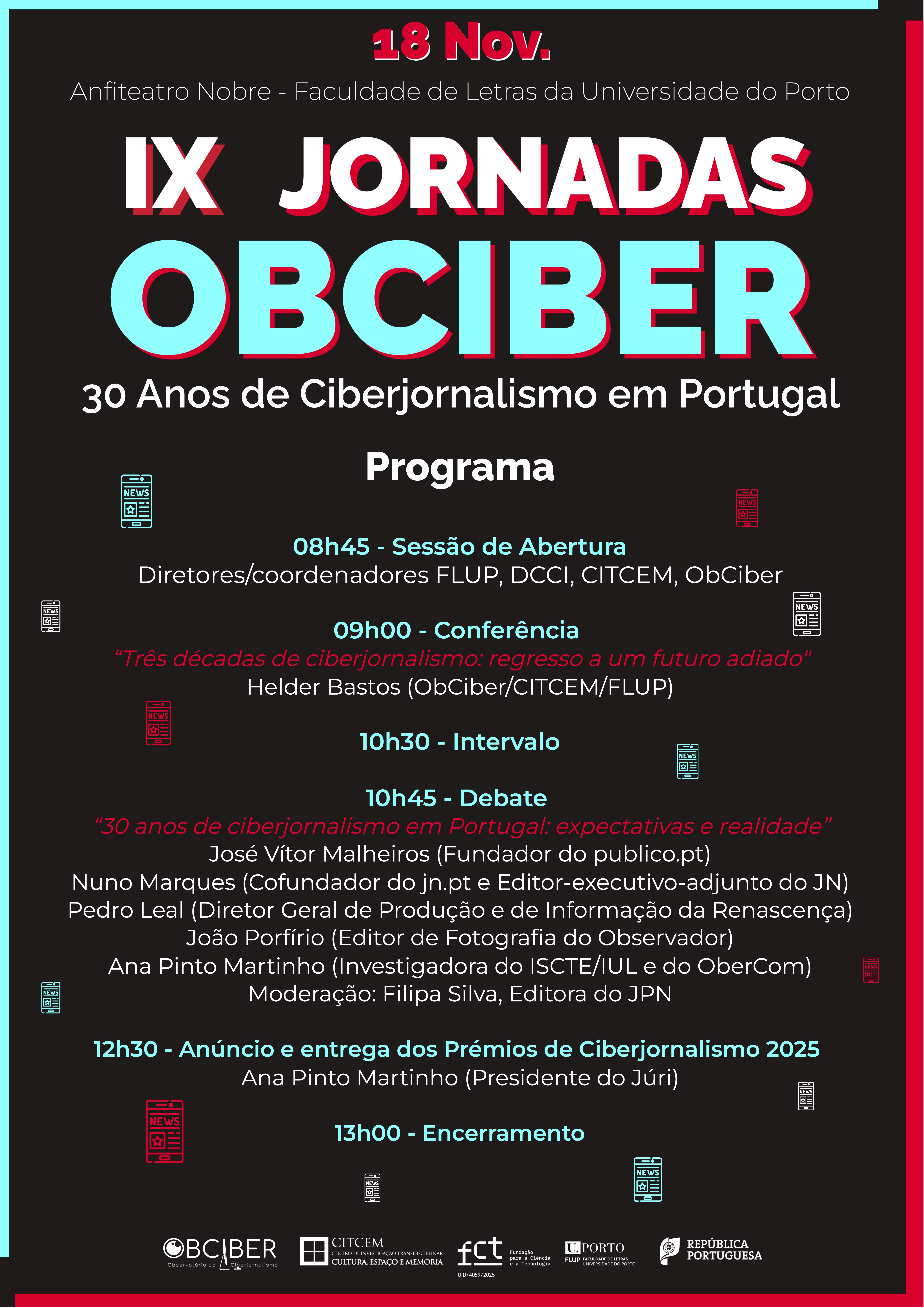 As Jornadas são organizadas pelo ObCiber – Observatório do Ciberjornalismo, CITCEM – Centro de Investigação Transdisciplinar Cultura, Espaço e Memória e FLUP – Faculdade de Letras da Universidade do Porto.